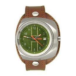 Quartz movement, Casual watch, Silver-tone luminous hands, Gray/Silver-tone numbers, Mineral crystal, Analog day display, Small white indexes on outer dial, Coin-edge stainless steel ratcheting bezel, Stainless steel crown, selector buttons, case and screw-in caseback, 100 meters/330 feet water resistant
